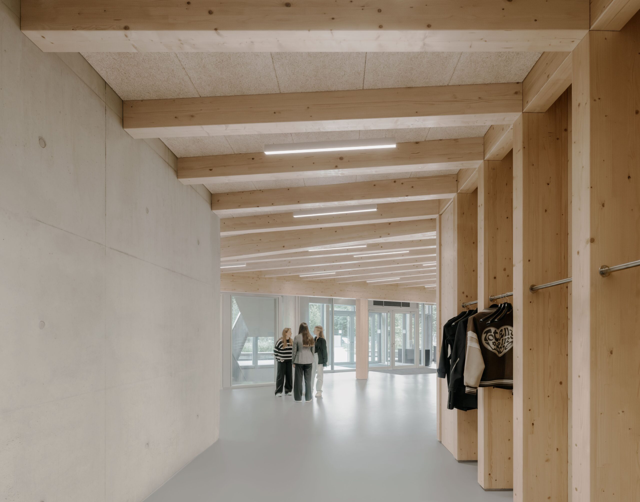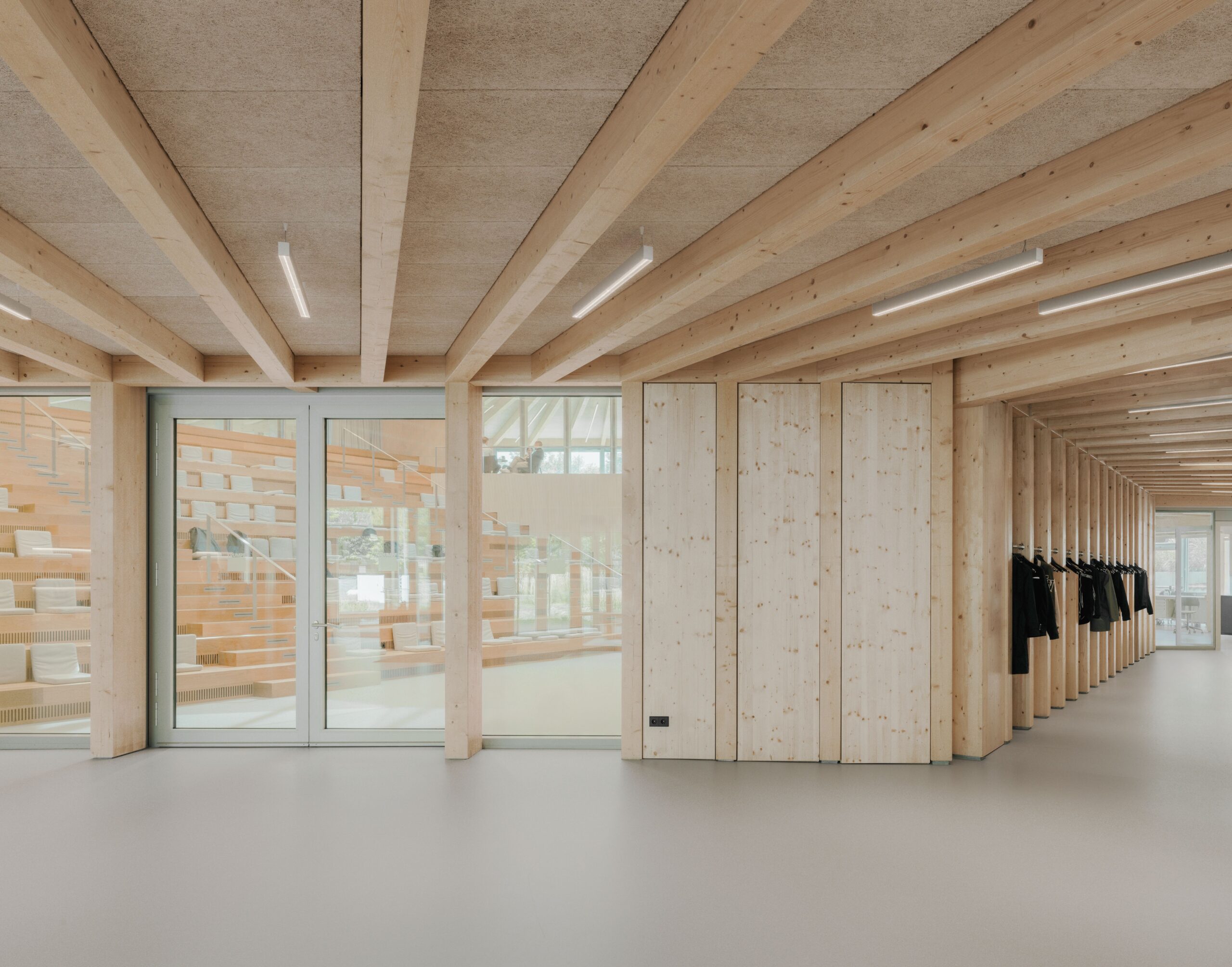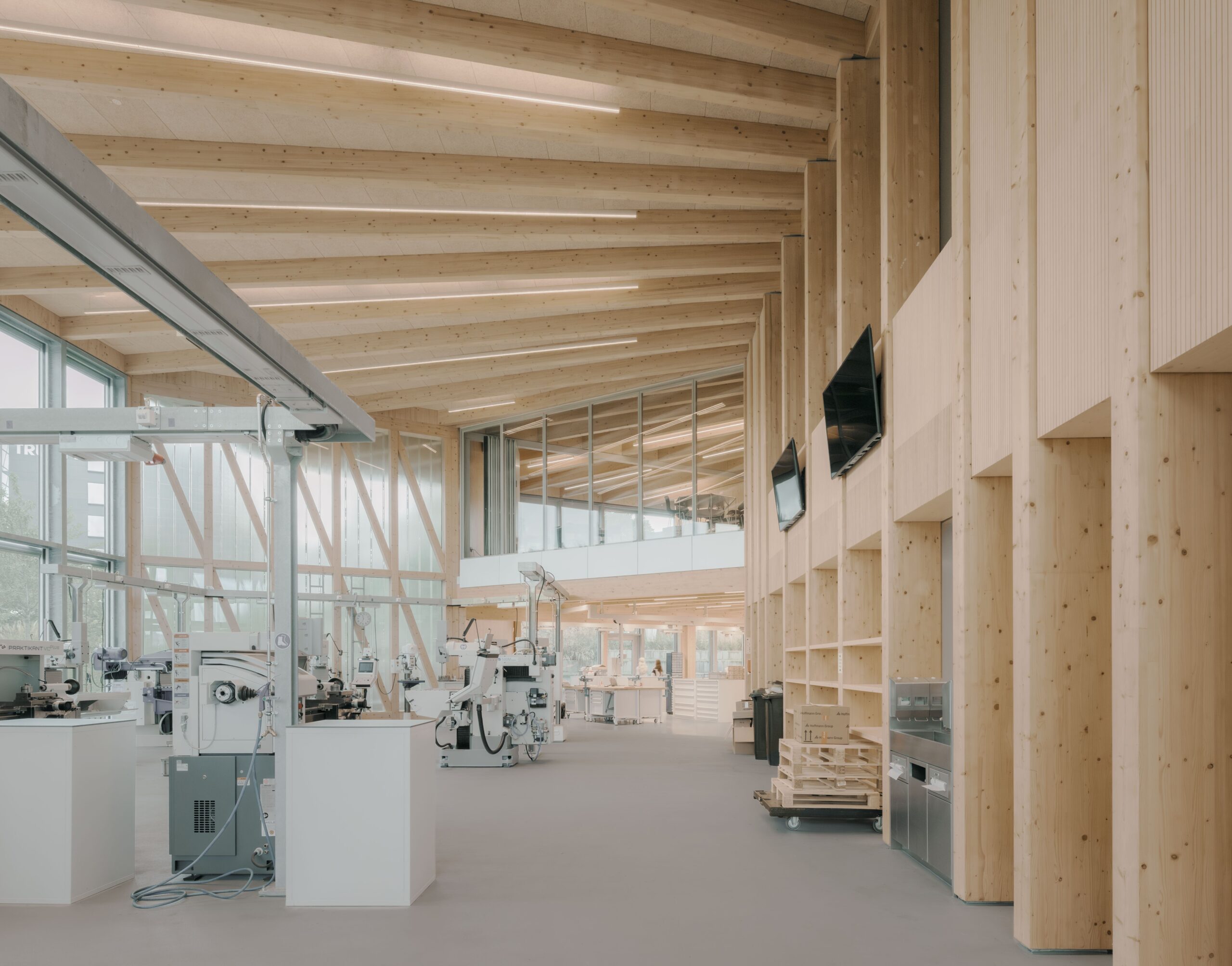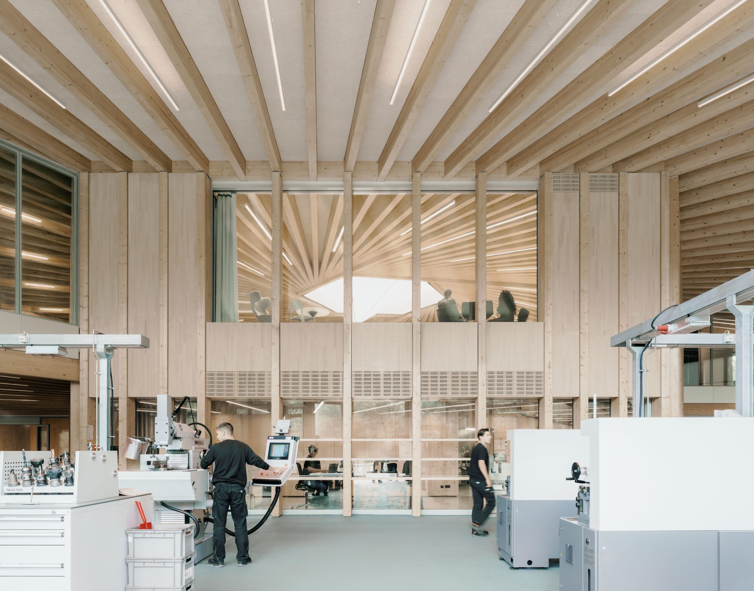 Eine tragende Konstruktion, kombiniert vorgefertigte Holztafel-Elemente mit einer Holz-Beton-Verbunddecke. Dadurch entstehen optimal statische und ökologische Vorteile. Die Möbel wurden perfekt in das Industriedesign und das moderne Gebäude eingebettet.